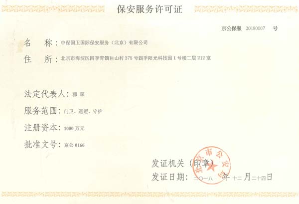 中保國衛國際保安服務(北京)有限公司,屬中保國衛集團旗下子公司。能全方位的為大型客戶提供優質的安保、押運服務,是集人防和技防于一體的新型正規化綜合安保押運服務企業,提供人防、物防、技防、聯網報*、非武裝押運等安防相關的一站式服務。